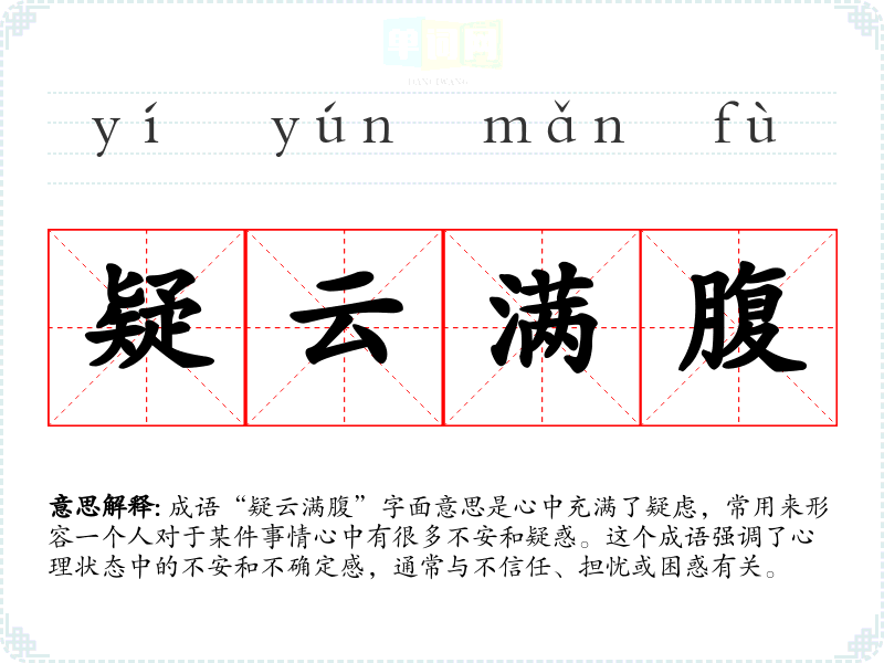 - 同义成语:心中疑虑、忧心忡忡、困惑不解。这些成语均表示心理上的不安和疑惑,但“疑云满腹”更强调情感的压抑和复杂性。