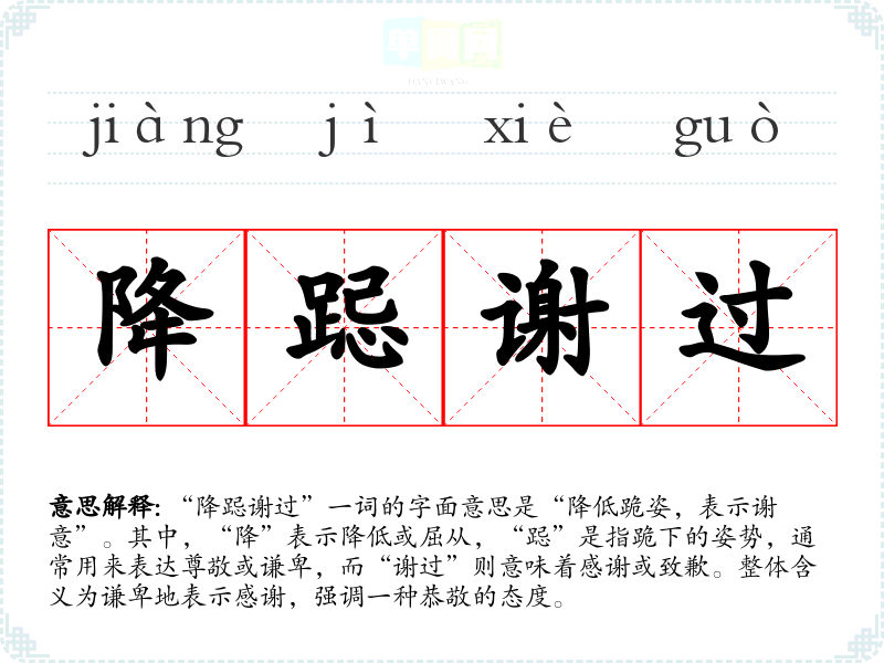 “降跽谢过”一词的字面意思是“降低跪姿,表示谢意”。其中,“降”表示降低或屈从,“跽”是指跪下的姿势,通常用来表达尊敬或谦卑,而“谢过”则意味着感谢或致歉。整体含义为谦卑地表示感谢,强调一种恭敬的态度。