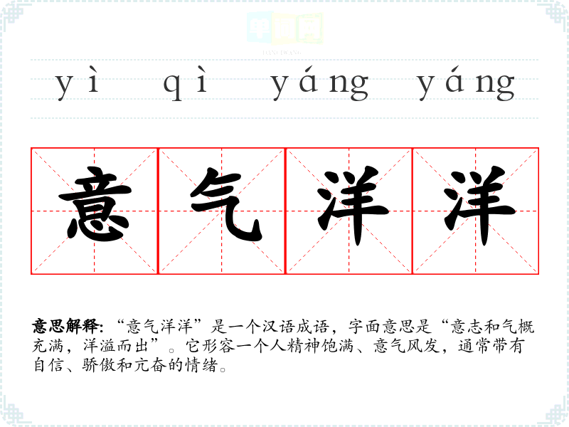 “意气洋洋”是一个汉语成语,字面意思是“意志和气概充满,洋溢而出”。它形容一个人精神饱满、意气风发,通常带有自信、骄傲和亢奋的情绪。