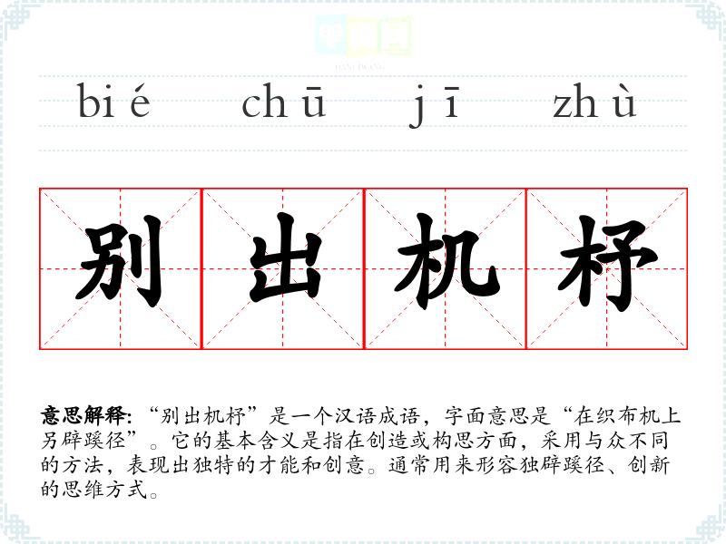 “别出机杼”是一个汉语成语,字面意思是“在织布机上另辟蹊径”。它的基本含义是指在创造或构思方面,采用与众不同的方法,表现出独特的才能和创意。通常用来形容独辟蹊径、创新的思维方式。