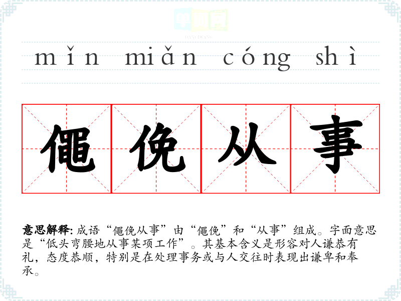 成语“僶俛从事”由“僶俛”和“从事”组成。字面意思是“低头弯腰地从事某项工作”。其基本含义是形容对人谦恭有礼,态度恭顺,特别是在处理事务或与人交往时表现出谦卑和奉承。