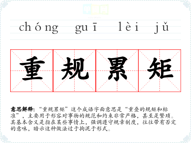 “重规累矩”这个成语字面意思是“重叠的规矩和标准”,主要用于形容对事物的规范和约束非常严格,甚至是繁琐。其基本含义是指在某些事情上,强调遵守规章制度,往往带有否定的意味,暗示这种做法过于拘泥于形式。