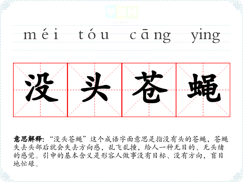“没头苍蝇”这个成语字面意思是指没有头的苍蝇,苍蝇失去头部后就会失去方向感,乱飞乱撞,给人一种无目的、无头绪的感觉。引申的基本含义是形容人做事没有目标、没有方向,盲目地忙碌。