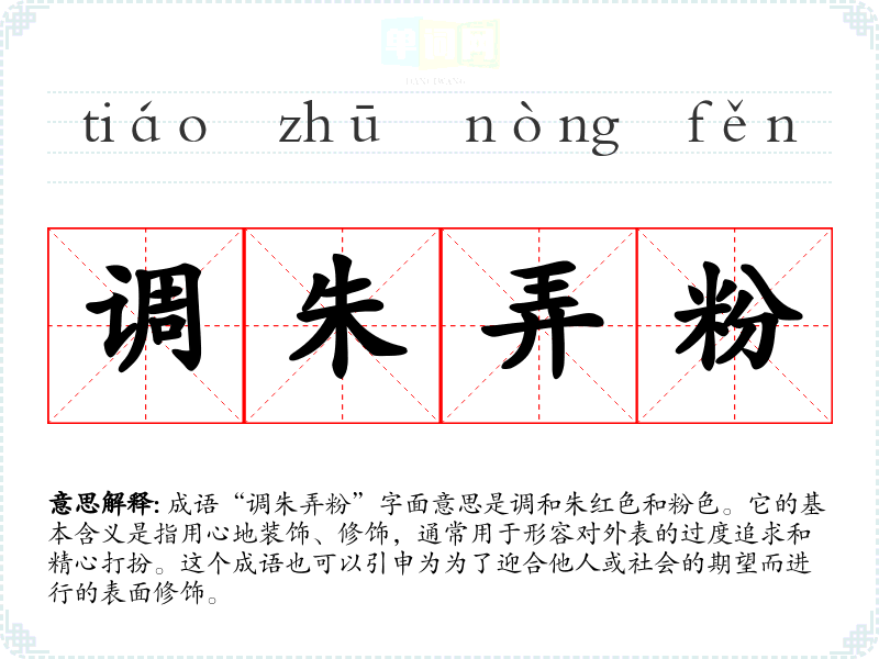 成语“调朱弄粉”字面意思是调和朱红色和粉色。它的基本含义是指用心地装饰、修饰,通常用于形容对外表的过度追求和精心打扮。这个成语也可以引申为为了迎合他人或社会的期望而进行的表面修饰。