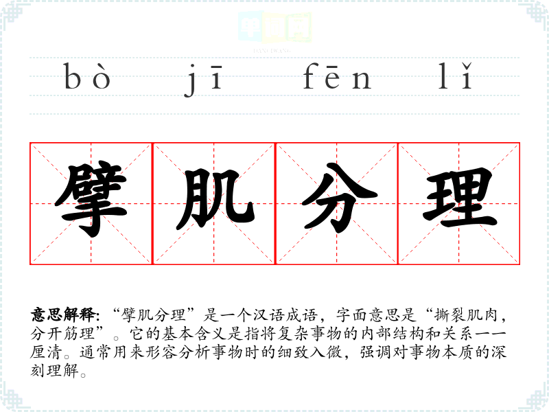 | 擘肌分理 | 擘:分开;理:肌肤的纹理。比喻分析事理十分细致。 |