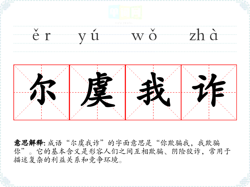 成语“尔虞我诈”的字面意思是“你欺骗我,我欺骗你”。它的基本含义是形容人们之间互相欺骗、阴险狡诈,常用于描述复杂的利益关系和竞争环境。