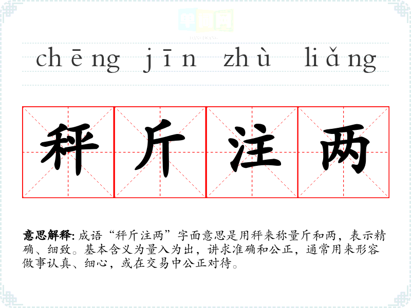 成语“秤斤注两”字面意思是用秤来称量斤和两,表示精确、细致。基本含义为量入为出,讲求准确和公正,通常用来形容做事认真、细心,或在交易中公正对待。
