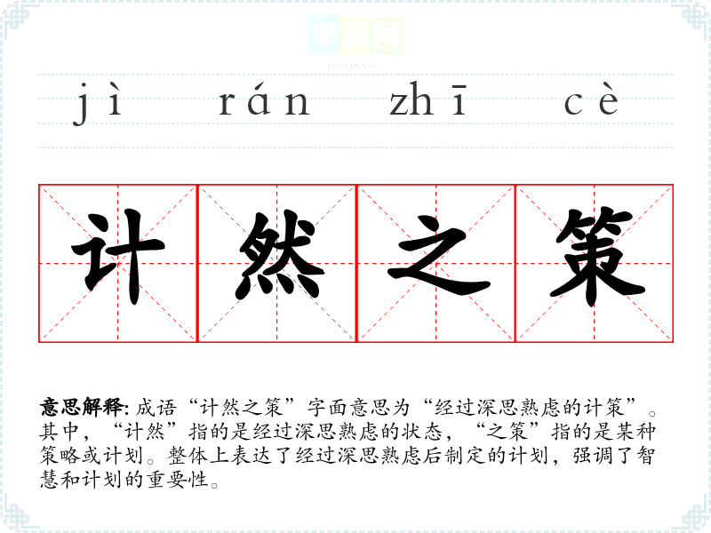 成语“计然之策”字面意思为“经过深思熟虑的计策”。其中,“计然”指的是经过深思熟虑的状态,“之策”指的是某种策略或计划。整体上表达了经过深思熟虑后制定的计划,强调了智慧和计划的重要性。
