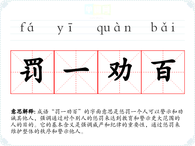 成语“罚一劝百”的字面意思是惩罚一个人可以警示和劝诫其他人,强调通过对个别人的惩罚来达到教育和警示更大范围的人的目的。它的基本含义是强调威严和纪律的重要性,通过惩罚来维护整体的秩序和警示他人。