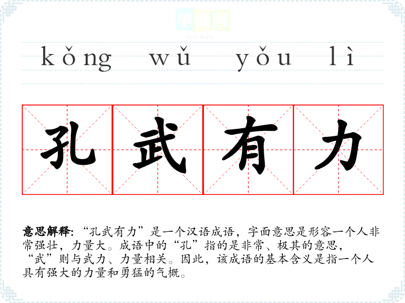 “孔武有力”源自于古代文献,最早见于《诗经》。其意在描述那些身体强壮、勇敢果敢的英雄人物。这个成语在历史上常用于形容那些在战争或体育中表现出色的人物,传达出一种对力量与勇气的赞美。