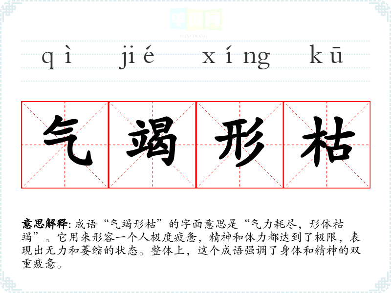成语“气竭形枯”的字面意思是“气力耗尽,形体枯竭”。它用来形容一个人极度疲惫,精神和体力都达到了极限,表现出无力和萎缩的状态。整体上,这个成语强调了身体和精神的双重疲惫。