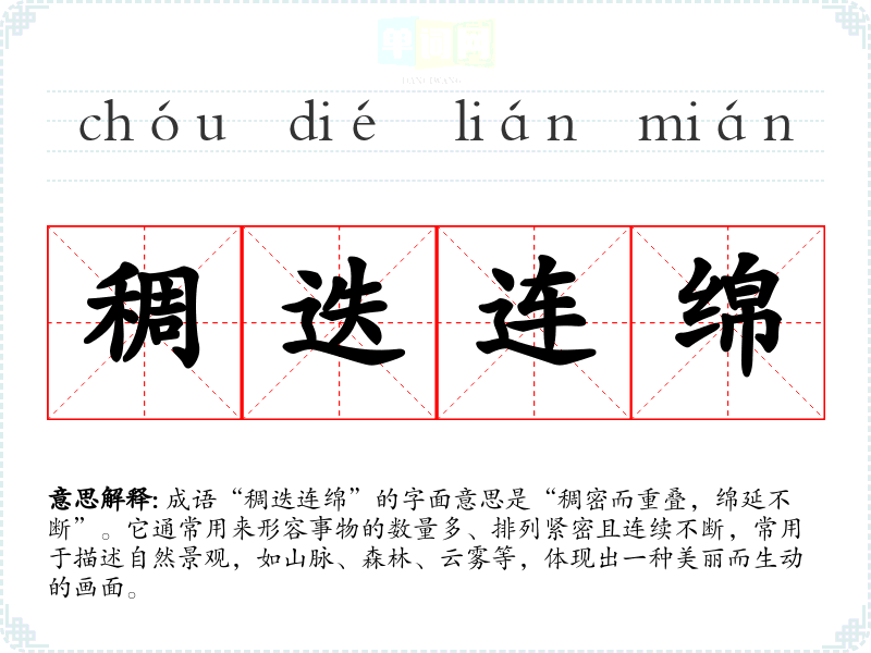成语“稠迭连绵”的字面意思是“稠密而重叠,绵延不断”。它通常用来形容事物的数量多、排列紧密且连续不断,常用于描述自然景观,如山脉、森林、云雾等,体现出一种美丽而生动的画面。