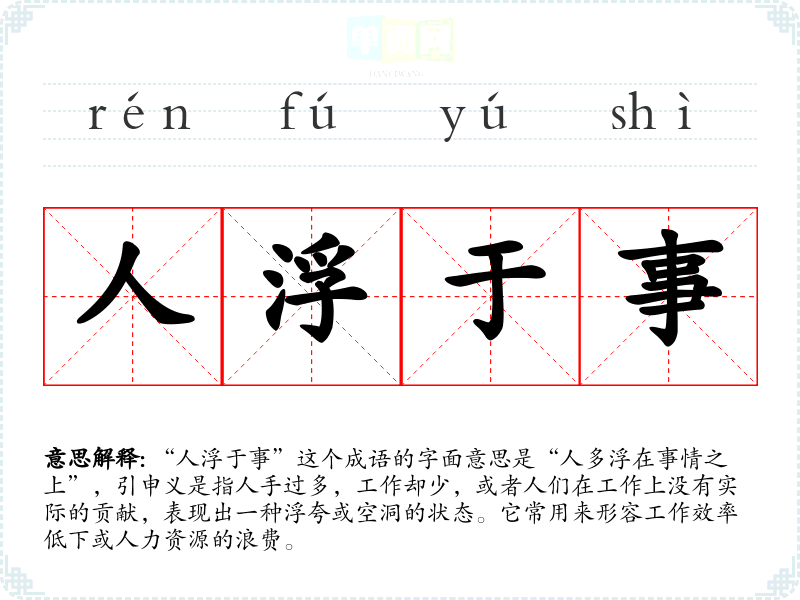 “人浮于事”这个成语的字面意思是“人多浮在事情之上”,引申义是指人手过多,工作却少,或者人们在工作上没有实际的贡献,表现出一种浮夸或空洞的状态。它常用来形容工作效率低下或人力资源的浪费。