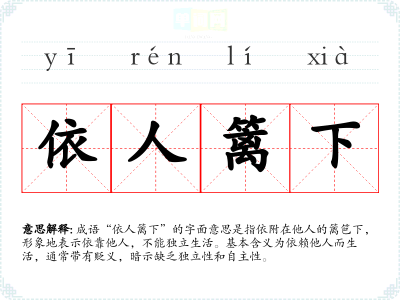 成语“依人篱下”的字面意思是指依附在他人的篱笆下,形象地表示依靠他人,不能独立生活。基本含义为依赖他人而生活,通常带有贬义,暗示缺乏独立性和自主性。