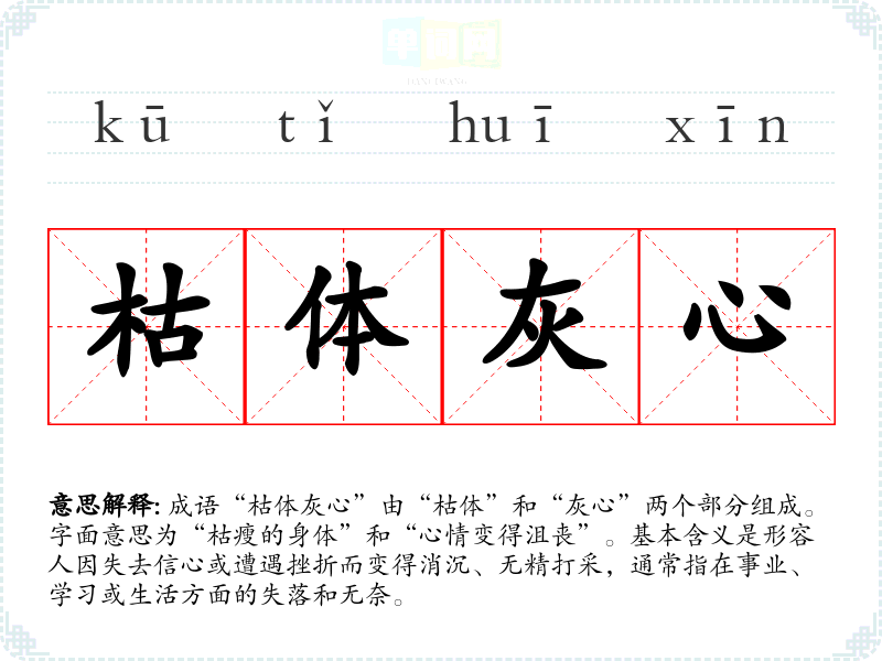 成语“枯体灰心”由“枯体”和“灰心”两个部分组成。字面意思为“枯瘦的身体”和“心情变得沮丧”。基本含义是形容人因失去信心或遭遇挫折而变得消沉、无精打采,通常指在事业、学*或生活方面的失落和无奈。