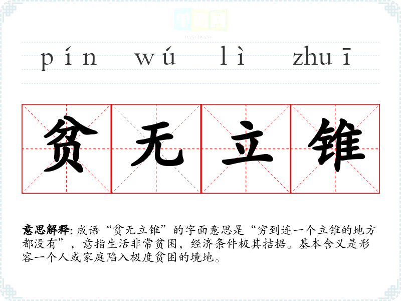 成语“贫无立锥”的字面意思是“穷到连一个立锥的地方都没有”,意指生活非常贫困,经济条件极其拮据。基本含义是形容一个人或家庭陷入极度贫困的境地。