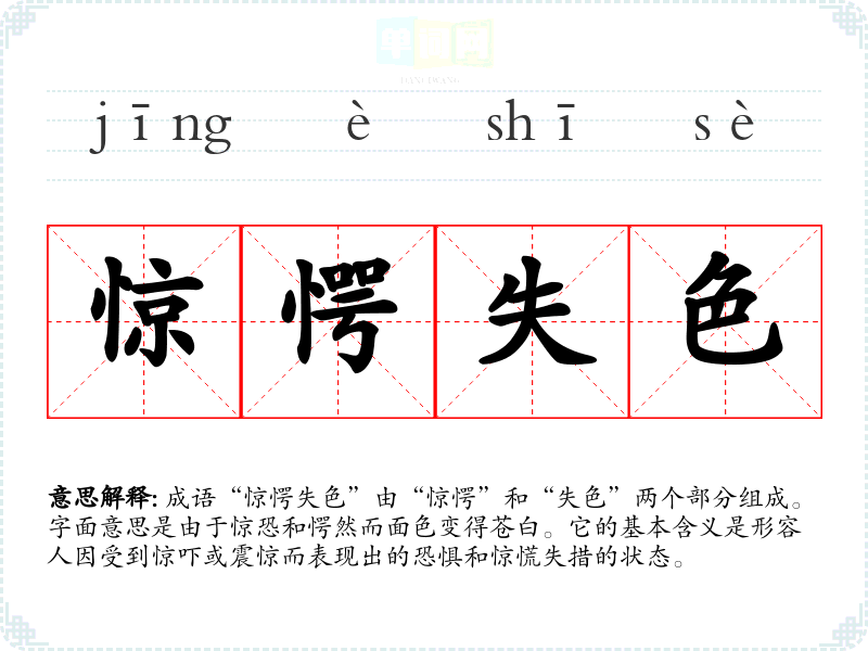 成语“惊愕失色”由“惊愕”和“失色”两个部分组成。字面意思是由于惊恐和愕然而面色变得苍白。它的基本含义是形容人因受到惊吓或震惊而表现出的恐惧和惊慌失措的状态。