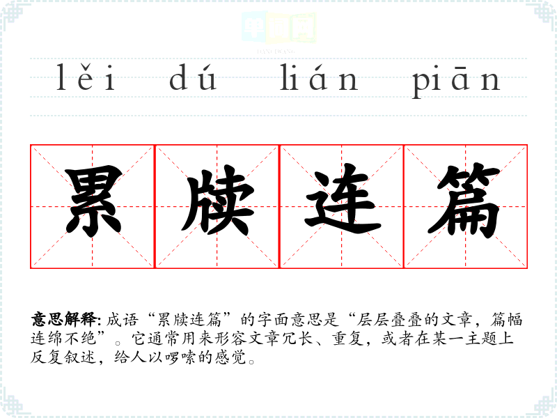 成语“累牍连篇”的字面意思是“层层叠叠的文章,篇幅连绵不绝”。它通常用来形容文章冗长、重复,或者在某一主题上反复叙述,给人以啰嗦的感觉。