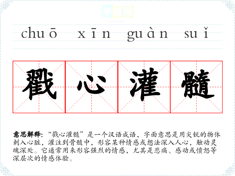 “戳心灌髓”并没有明确的历史典故,但其构成的字词本身在**古典文学中经常出现。成语中“戳心”意指刺痛心灵,而“灌髓”则暗示着情感的渗透和深远影响。这种表达方式在古代诗词中用来形容情感的极致体验,强调情感的深刻和难以言喻。