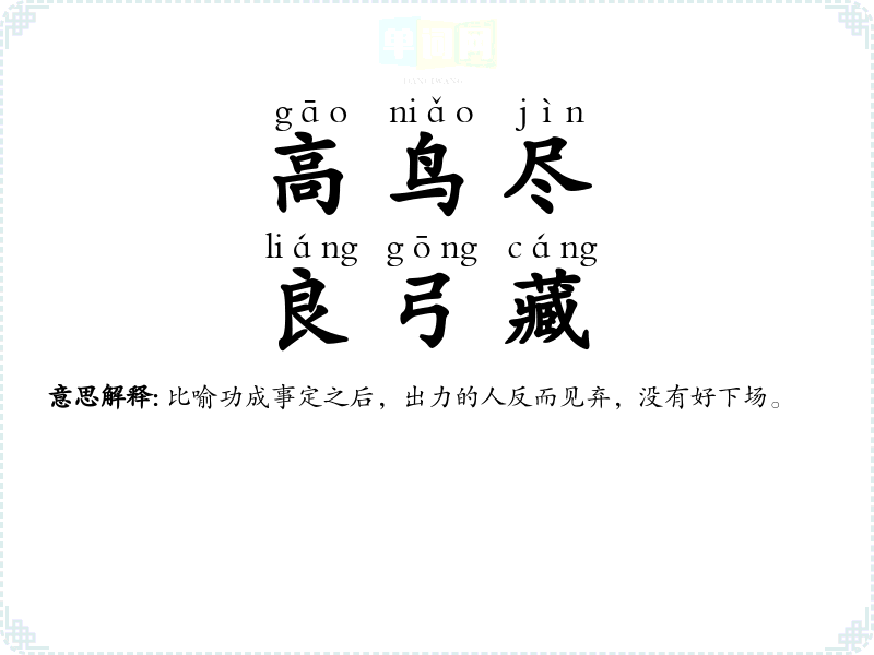 | 善刀而藏 | 善:拭;善刀:把刀擦干净。将刀擦净,收藏起来。比喻适可而止,自敛其才。 |
