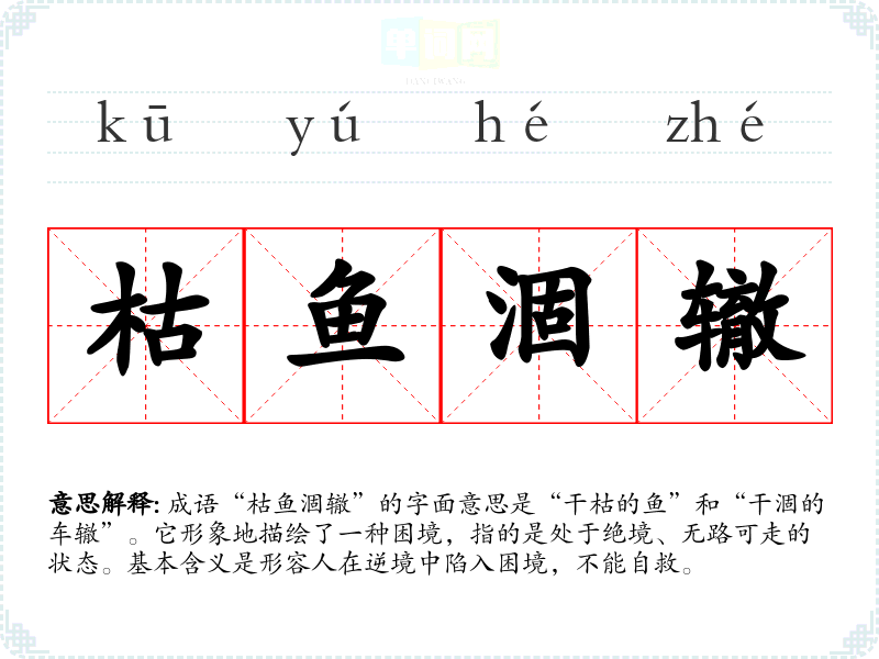 成语“枯鱼涸辙”的字面意思是“干枯的鱼”和“干涸的车辙”。它形象地描绘了一种困境,指的是处于绝境、无路可走的状态。基本含义是形容人在逆境中陷入困境,不能自救。