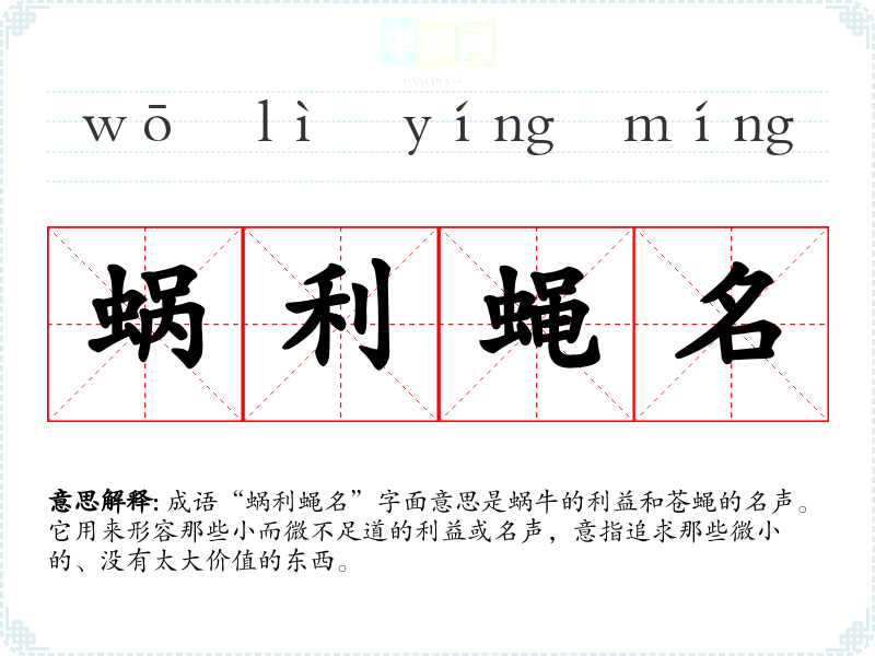 | 蜗名蝇利 | 蜗名:象蜗牛角那样微小的名声;蝇利:苍蝇般大的利益。比喻虚名小利。 |