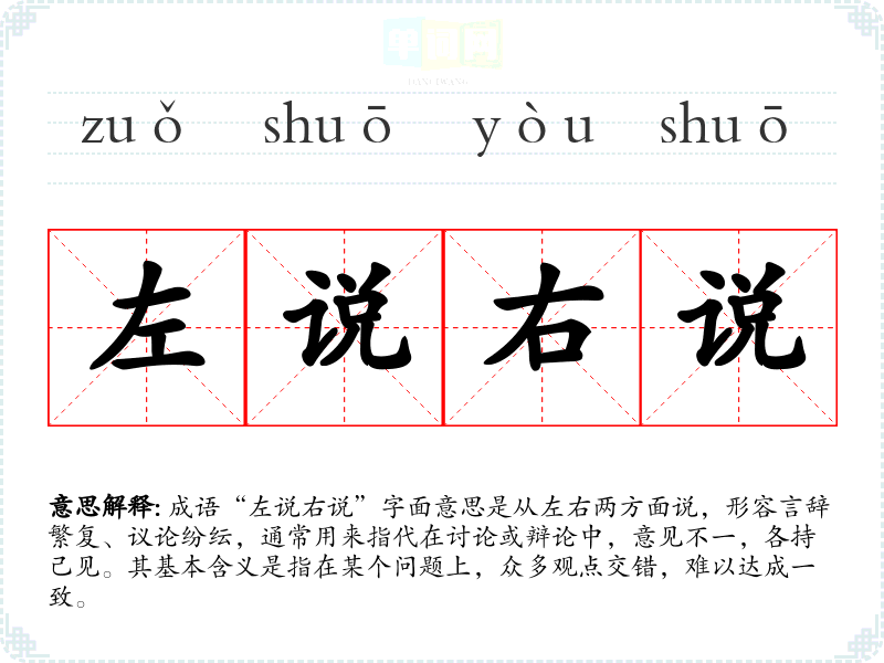 成语“左说右说”字面意思是从左右两方面说,形容言辞繁复、议论纷纭,通常用来指代在讨论或辩论中,意见不一,各持己见。其基本含义是指在某个问题上,众多观点交错,难以达成一致。