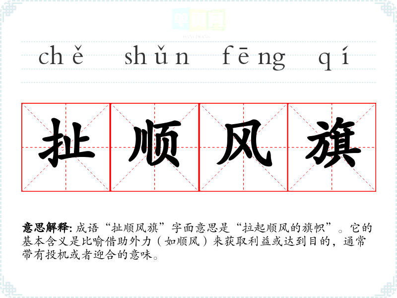 成语“扯顺风旗”字面意思是“拉起顺风的旗帜”。它的基本含义是比喻借助外力(如顺风)来获取利益或达到目的,通常带有投机或者迎合的意味。
