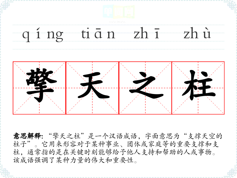 通过对“擎天之柱”的学,我更加理解了责任和支持的重要性。这个成语不仅丰富了我的语言表达,也让我在日常生活中更关注那些在关键时刻能够给予帮助的人。它在我的语言学和表达中具有重要的价值,提醒我珍视身边的“擎天之柱”。