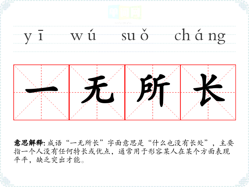 成语“一无所长”字面意思是“什么也没有长处”,主要指一个人没有任何特长或优点,通常用于形容某人在某个方面表现平平,缺乏突出才能。