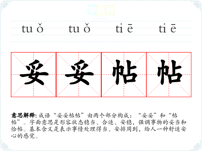 成语“妥妥帖帖”由两个部分构成:“妥妥”和“帖帖”。字面意思是形容状态稳当、合适、安稳,强调事物的妥当和恰帖。基本含义是表示事情处理得当、安排周到,给人一种舒适安心的感觉。