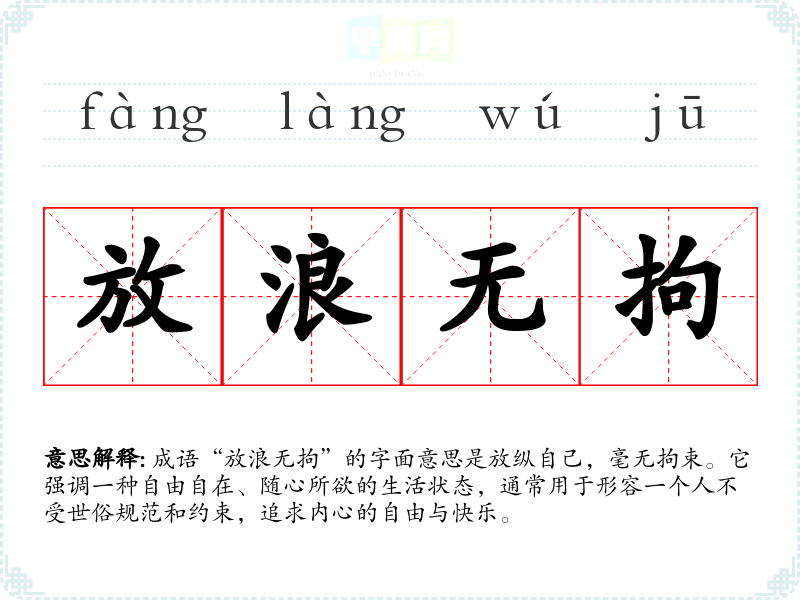 成语“放浪无拘”的字面意思是放纵自己,毫无拘束。它强调一种自由自在、随心所欲的生活状态,通常用于形容一个人不受世俗规范和约束,追求内心的自由与快乐。