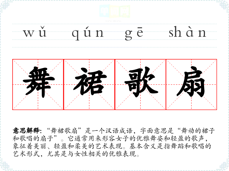 “舞裙歌扇”源自古代的文人雅集和歌舞表演,尤其在唐宋时期的宫廷和文人圈中,歌舞作为一种重要的艺术形式受到极大的重视。历史上,这一成语可能与一些古典文学作品中的描写有关,例如诗词中常常提到女子的舞姿与歌声,表现出那种轻盈优雅的美感。