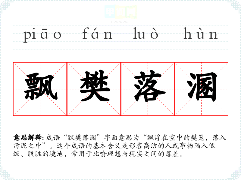 成语“飘樊落溷”字面意思为“飘浮在空中的樊笼,落入污泥之中”。这个成语的基本含义是形容高洁的人或事物陷入低级、肮脏的境地,常用于比喻理想与现实之间的落差。