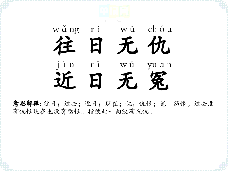 | 往日无仇,近日无冤 | 往日:过去;近日:现在;仇:仇恨;冤:怨恨。过去没有仇恨现在也没有怨恨。指彼此一向没有冤仇。 |