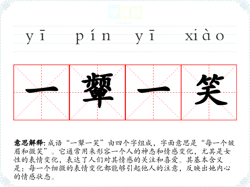 成语“一颦一笑”由四个字组成,字面意思是“每一个皱眉和微笑”。它通常用来形容一个人的神态和情感变化,尤其是女性的表情变化,表达了人们对其情感的关注和喜爱。其基本含义是:每一个细微的表情变化都能够引起他人的注意,反映出她内心的情感状态。