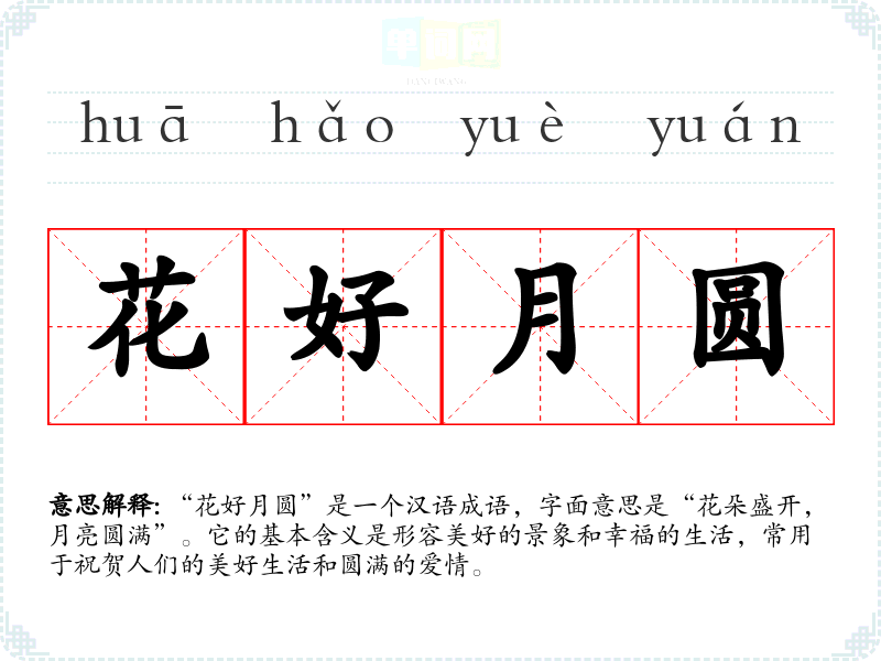 “花好月圆”是一个汉语成语,字面意思是“花朵盛开,月亮圆满”。它的基本含义是形容美好的景象和幸福的生活,常用于祝贺人们的美好生活和圆满的爱情。