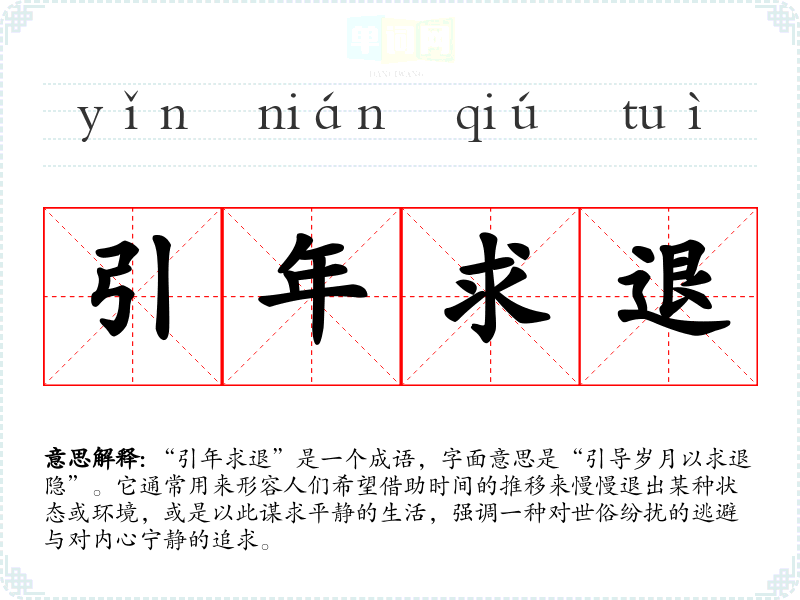 “引年求退”是一个成语,字面意思是“引导岁月以求退隐”。它通常用来形容人们希望借助时间的推移来慢慢退出某种状态或环境,或是以此谋求平静的生活,强调一种对世俗纷扰的逃避与对内心宁静的追求。