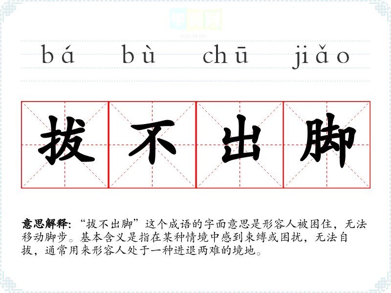 “拔不出脚”这个成语的字面意思是形容人被困住,无法移动脚步。基本含义是指在某种情境中感到束缚或困扰,无法自拔,通常用来形容人处于一种进退两难的境地。