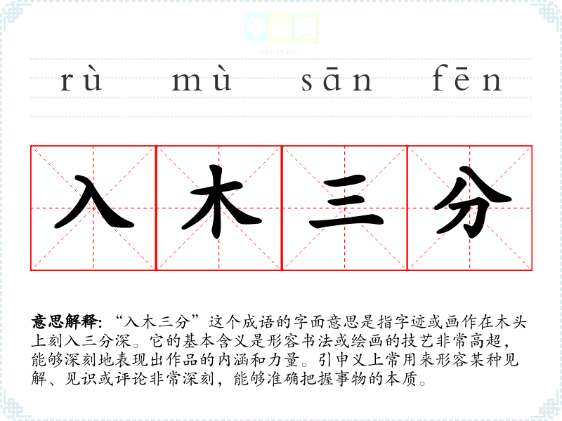 “入木三分”这个成语的字面意思是指字迹或画作在木头上刻入三分深。它的基本含义是形容书法或绘画的技艺非常高超,能够深刻地表现出作品的内涵和力量。引申义上常用来形容某种见解、见识或评论非常深刻,能够准确把握事物的本质。