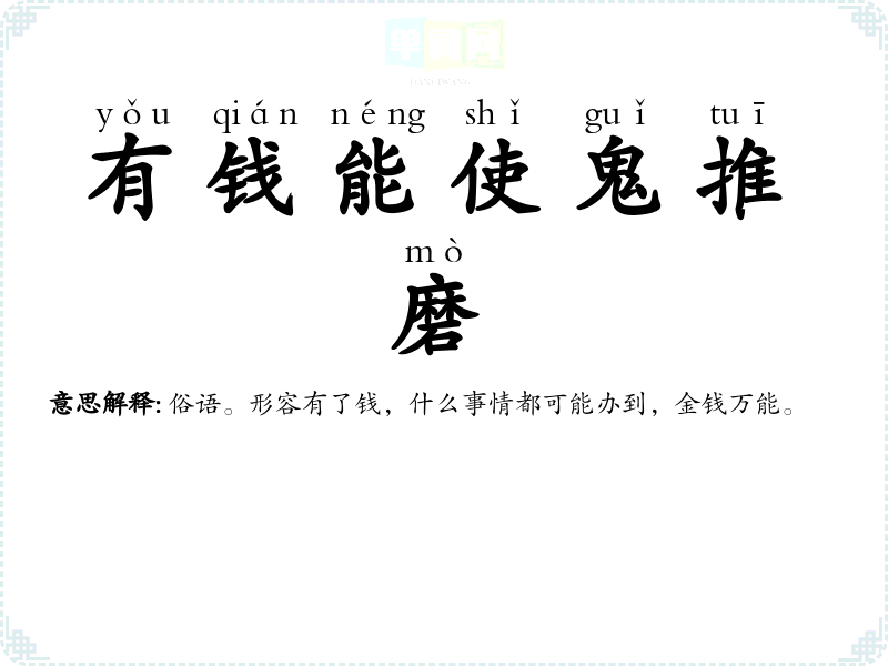| 有钱使得鬼推磨 | 俗语。形容有了钱,什么事情都可能办到,金钱万能。 |
