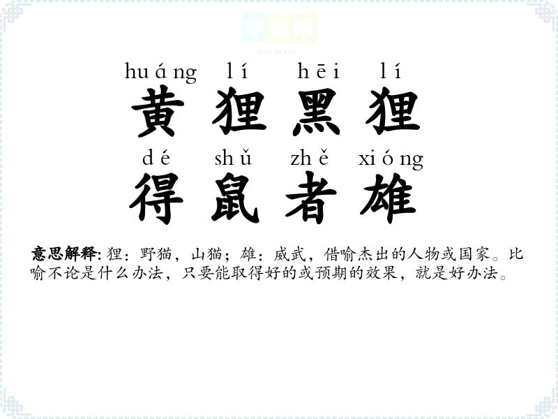 | 黄狸黑狸,得鼠者雄 | 狸:野猫,山猫;雄:威武,借喻杰出的人物或国家。比喻不论是什么办法,只要能取得好的或预期的效果,就是好办法。 |