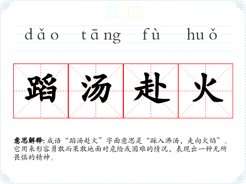 成语“蹈汤赴火”字面意思是“踩入沸汤,走向火焰”。它用来形容勇敢而果敢地面对危险或困难的情况,表现出一种无所畏惧的精神。