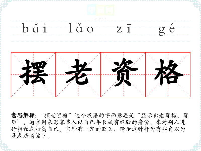 “摆老资格”这个成语的字面意思是“显示出老资格、资历”,通常用来形容某人以自己年长或有经验的身份,来对别人进行指教或抬高自己。它带有一定的贬义,暗示这种行为有些自以为是或居高临下。
