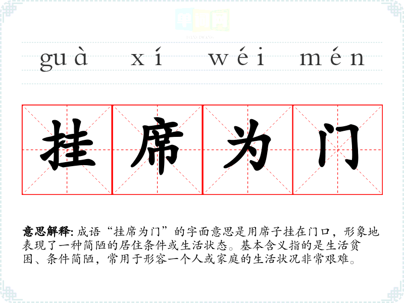 成语“挂席为门”的字面意思是用席子挂在门口,形象地表现了一种简陋的居住条件或生活状态。基本含义指的是生活贫困、条件简陋,常用于形容一个人或家庭的生活状况非常艰难。