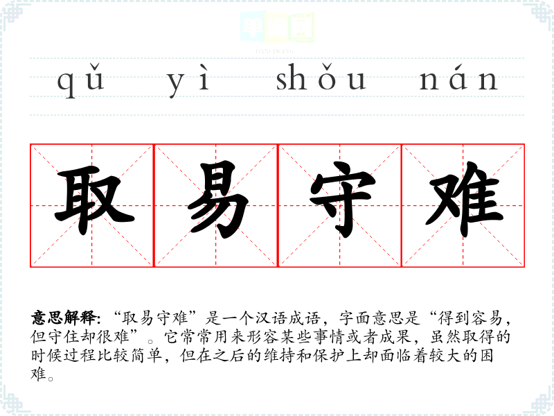 “取易守难”是一个汉语成语,字面意思是“得到容易,但守住却很难”。它常常用来形容某些事情或者成果,虽然取得的时候过程比较简单,但在之后的维持和保护上却面临着较大的困难。