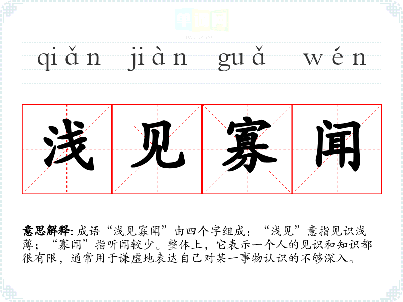 成语“浅见寡闻”由四个字组成:“浅见”意指见识浅*;“寡闻”指听闻较少。整体上,它表示一个人的见识和知识都很有限,通常用于谦虚地表达自己对某一事物认识的不够深入。