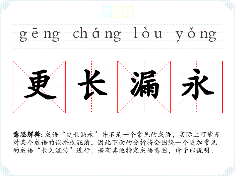 成语“更长漏永”并不是一个常见的成语,实际上可能是对某个成语的误拼或混淆,因此下面的分析将会围绕一个更加常见的成语“长久流传”进行。若有其他特定成语意图,请予以说明。