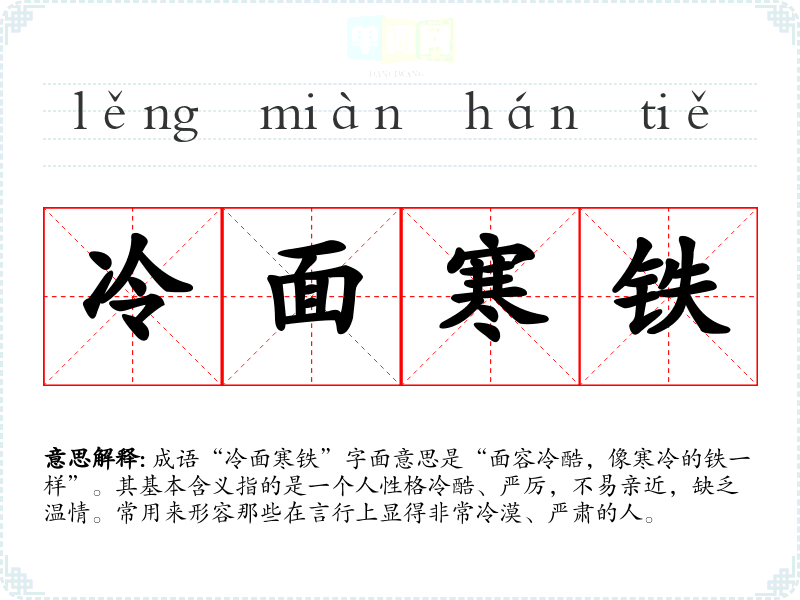 成语“冷面寒铁”字面意思是“面容冷酷,像寒冷的铁一样”。其基本含义指的是一个人性格冷酷、严厉,不易亲近,缺乏温情。常用来形容那些在言行上显得非常冷漠、严肃的人。