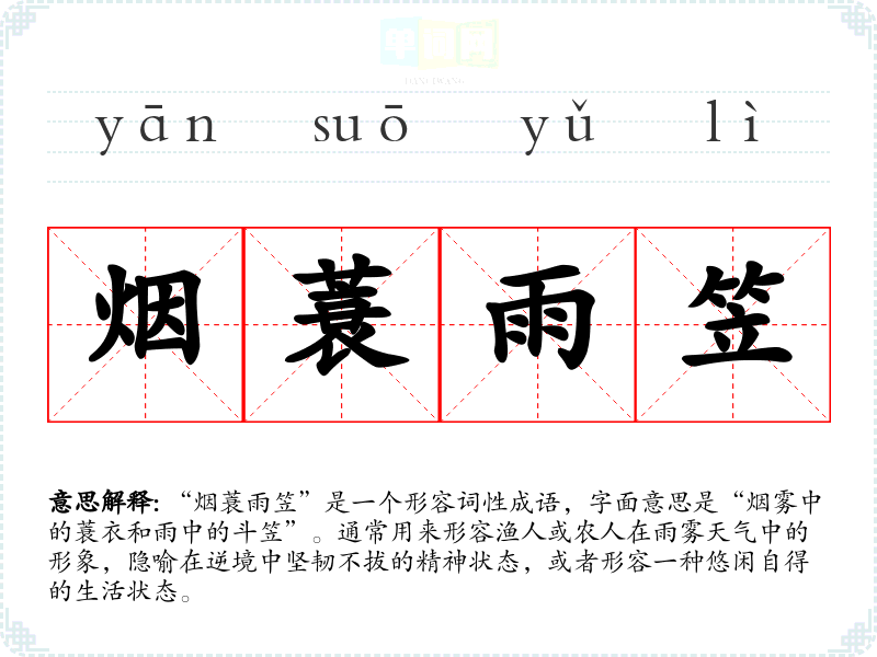 “烟蓑雨笠”是一个形容词性成语,字面意思是“烟雾中的蓑衣和雨中的斗笠”。通常用来形容渔人或农人在雨雾天气中的形象,隐喻在逆境中坚韧不拔的精神状态,或者形容一种悠闲自得的生活状态。